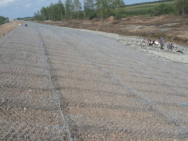 雷诺护垫也叫石笼护垫,格宾护垫,是指由机编双绞合六边形金属网面构成的厚度远小于长度和宽度的垫形工程构件。雷诺护垫中装入块石等填充料后连接成一体,成为主要用于水利堤防、岸坡等的防冲刷结构,具有柔性、对地基适应性的优点。